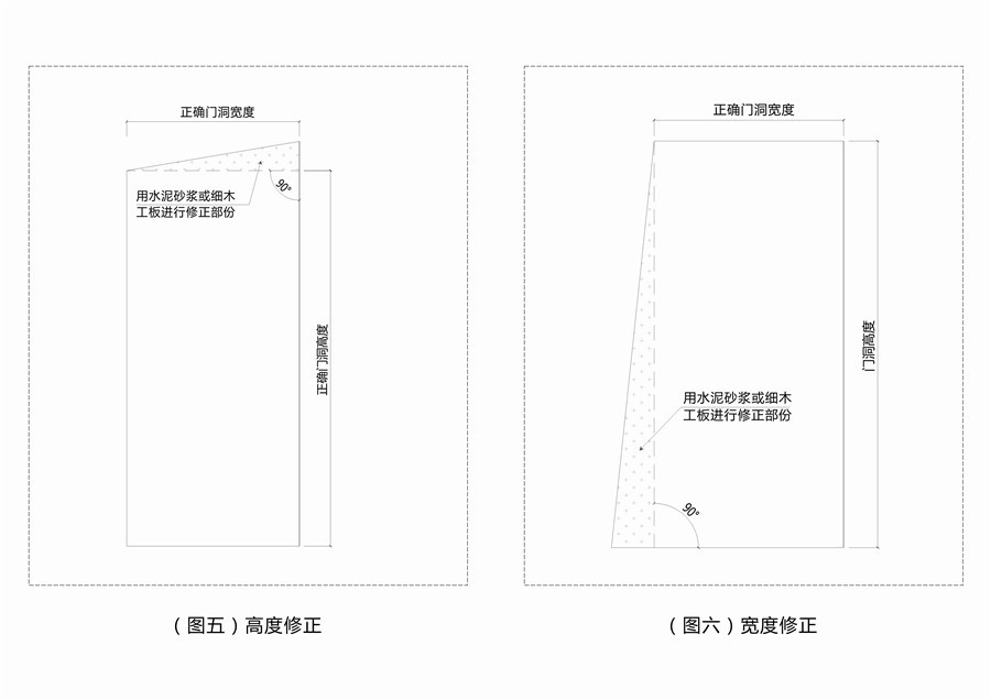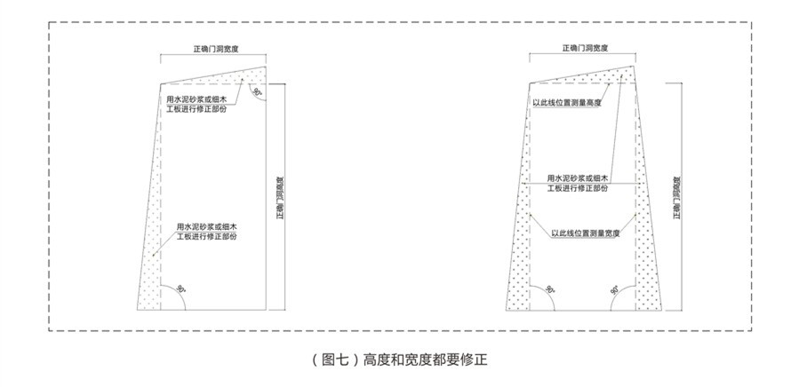 对于误差超过20mm的要对墙洞进行修正,可以用水泥砂浆或石灰进行修正。修正图如下: